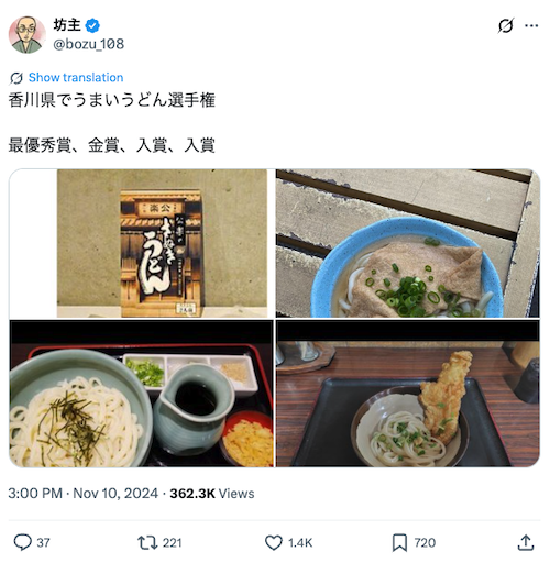その美味しさは四国を超えて全国的にも有名で、SNSのXで200万フォロワーを超えるインフルエンサー・坊主により開催された〝香川県でうまいうどん選手権〟で、店舗で提供されるうどんを差し置き、最優秀賞を獲得しています。