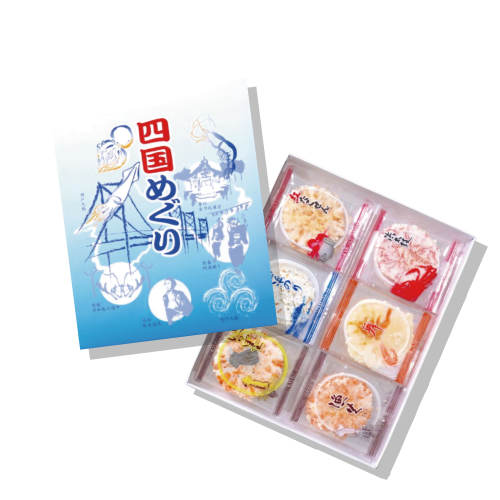 こちらの『四国めぐり』は、漁火・舞・浜太鼓・いか墨・磯浜のり・紅たこの計6種の煎餅が計20枚入っています